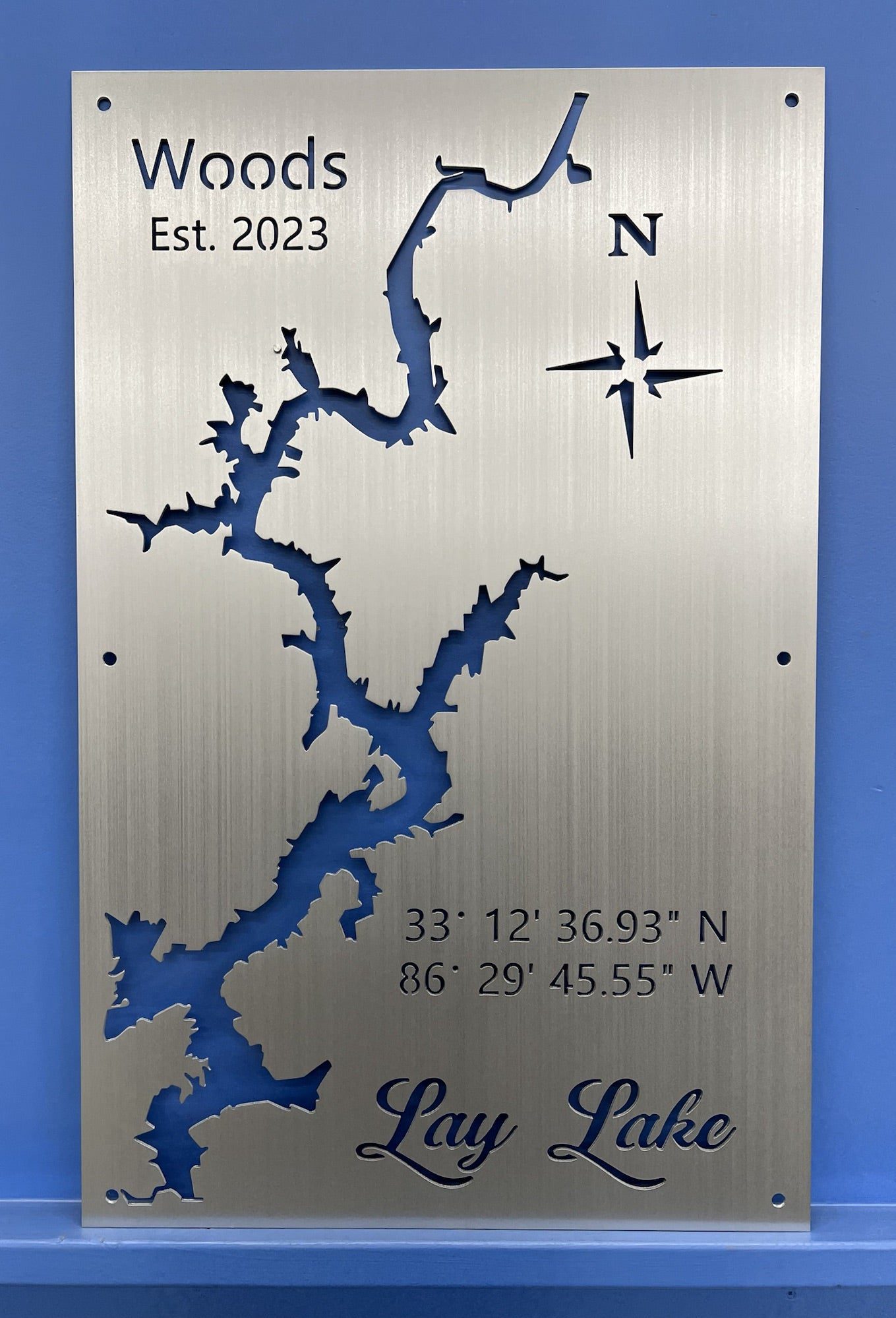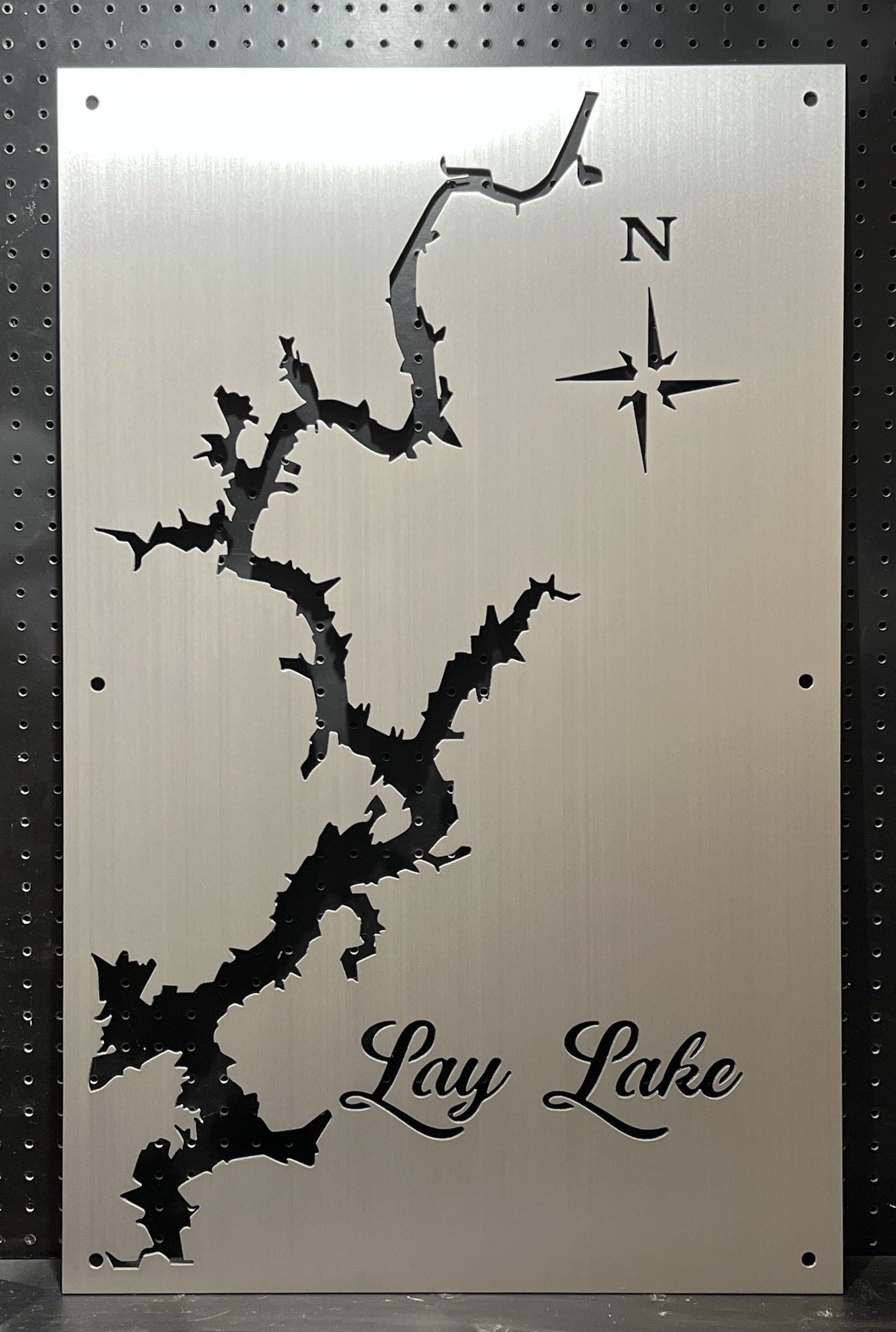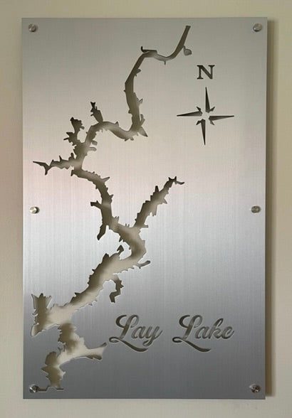 Our Lay Lake Metal Lake Map is 23″x38″ in size and when mounted, your custom lake map will appear to be floating 3/4 Inch off the wall using our standard hardware. Each of our Custom Lake Maps are made from 1/8′ Sheet Aluminum, brushed and then clear coated. They can be mounted indoors or outside with no problem.