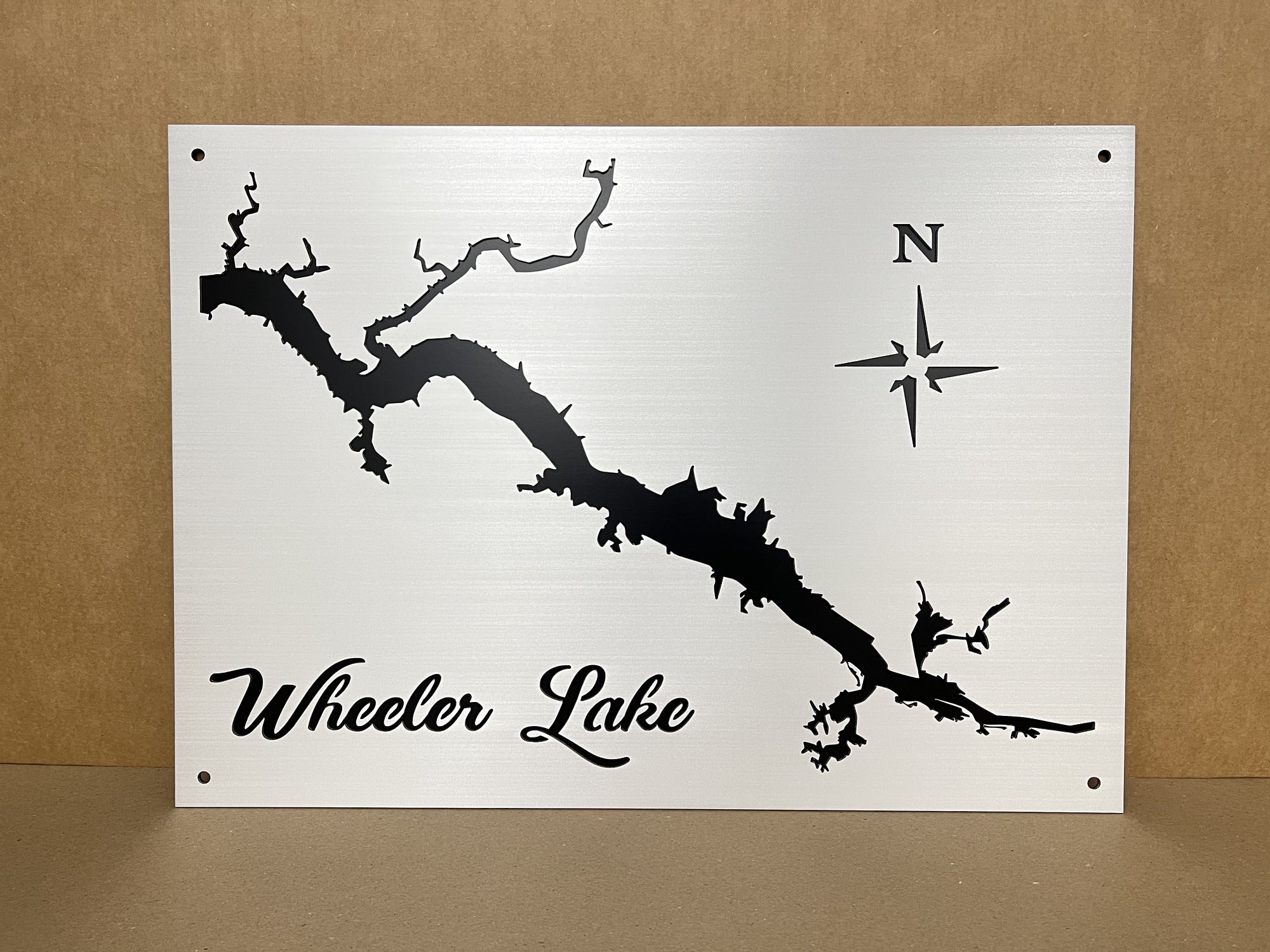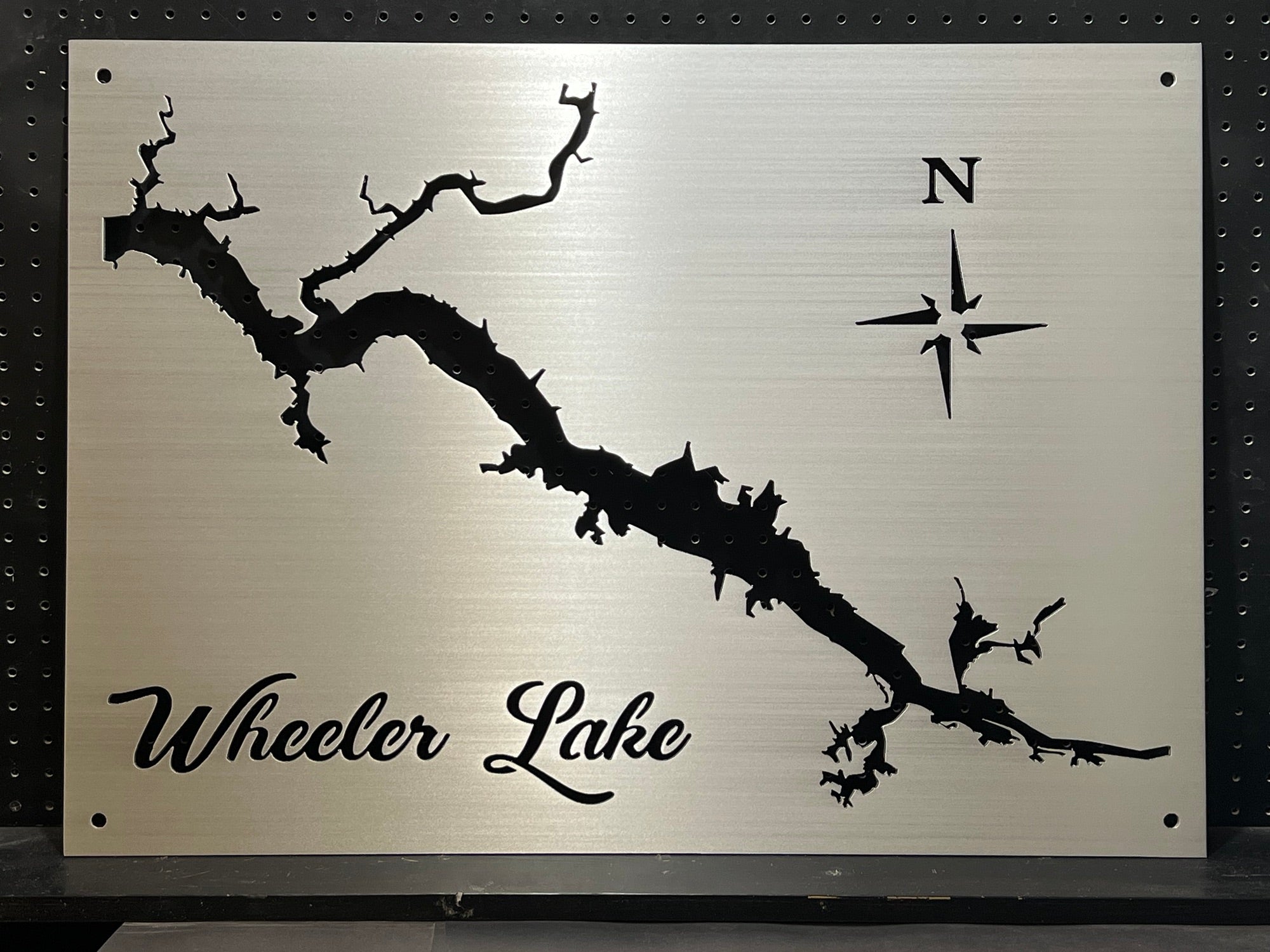 Our Wheeler Lake Metal Lake Map is 23″x30″ in size and when mounted, your map will appear to be floating 3/4 Inch off the wall using our standard hardware. Each Lake map is made from 1/8′ Sheet Aluminum, brushed and then clear coated. They can be mounted indoors or outside with no problem.