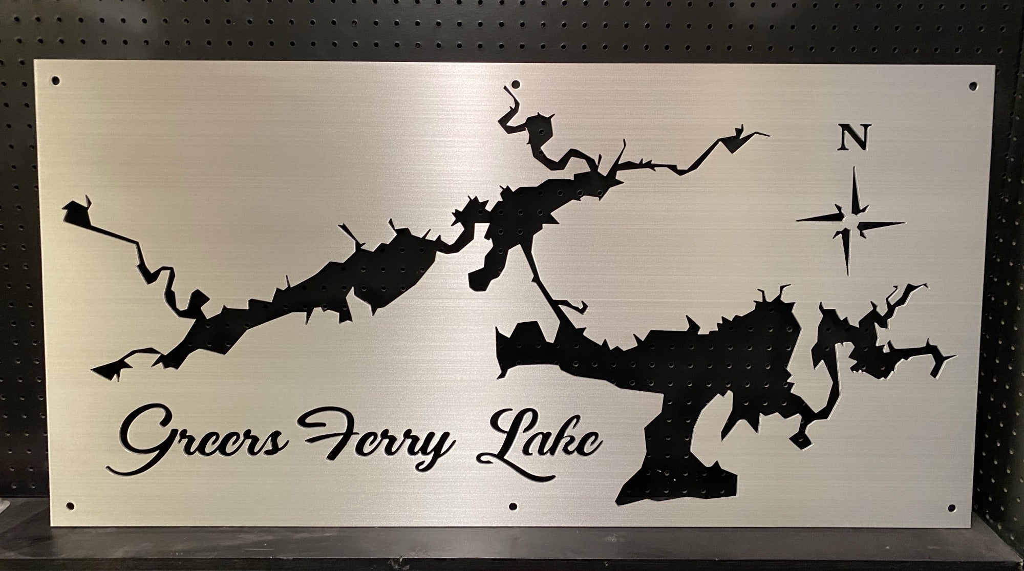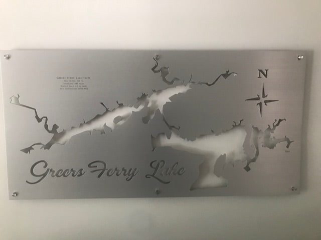 Greers Ferry Lake Metal Lake Map is 23×47″ in size and when mounted, your map will appear to be floating 3/4 Inch off the wall using our standard hardware. Each Lake map is made from 1/8′ Sheet Aluminum, brushed and then clear coated. They can be mounted indoors or outside with no problem.