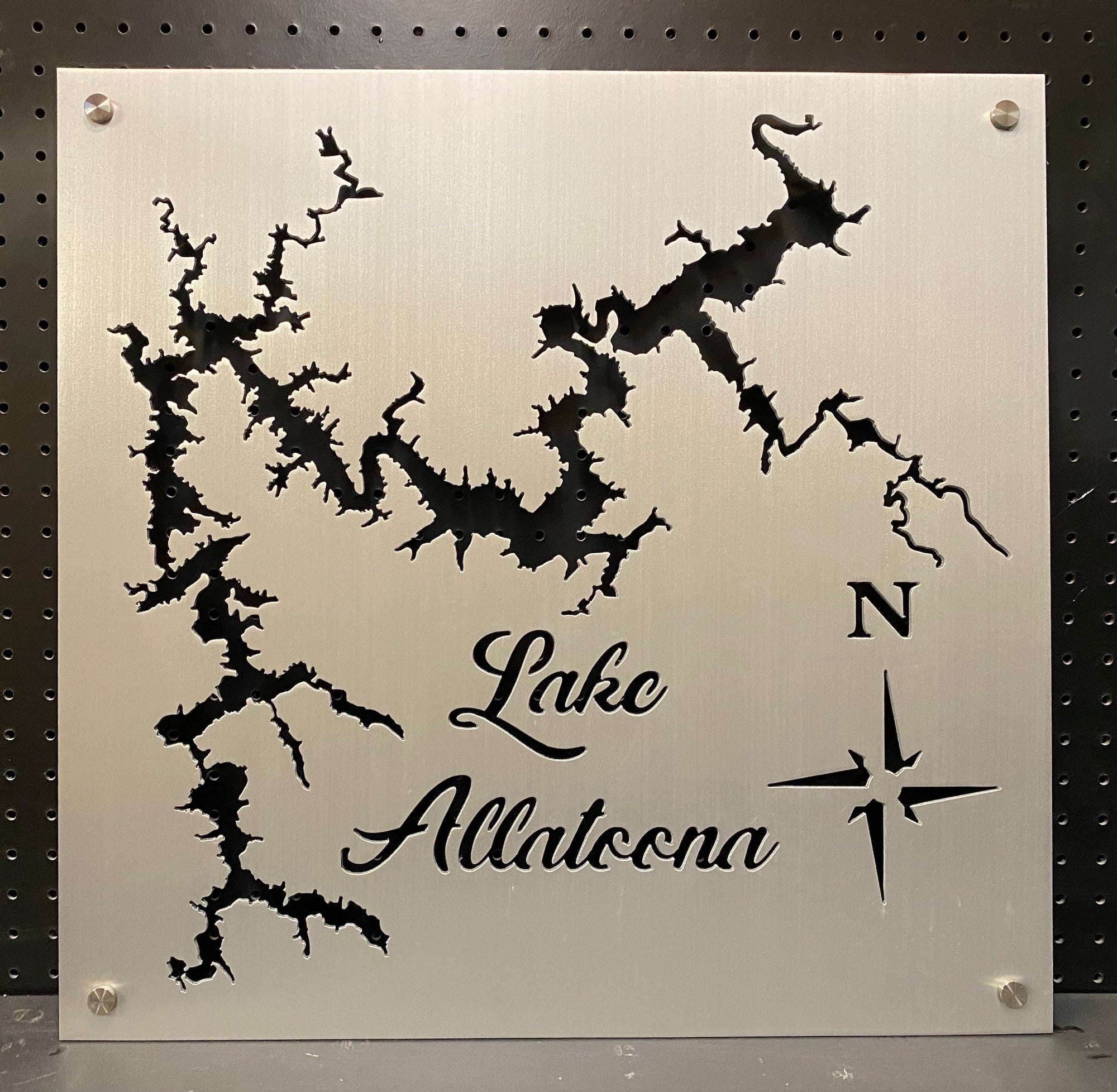 Our Lake Allatoona Metal Lake Map is 23×27″ in size and when mounted, your map will appear to be floating 3/4 Inch off the wall using our standard hardware. Each Lake map is made from 1/8′ Sheet Aluminum, brushed and then clear coated. They can be mounted indoors or outside with no problem.