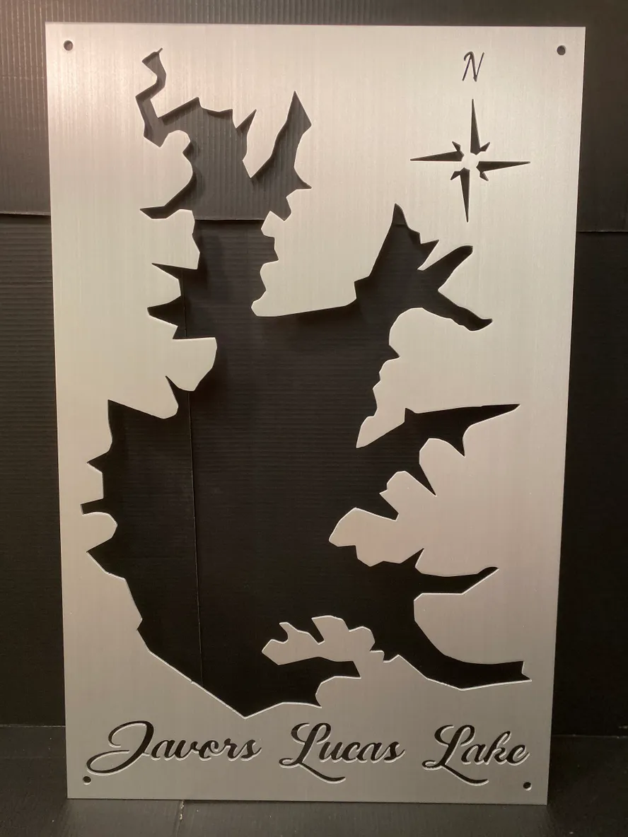 Our Jarvers Lucas Lake Metal Lake Map is 23×35″ in size and when mounted, your map will appear to be floating 3/4 Inch off the wall using our standard hardware. Each Lake map is made from 1/8′ Sheet Aluminum, brushed and then clear coated. They can be mounted indoors or outside with no problem.