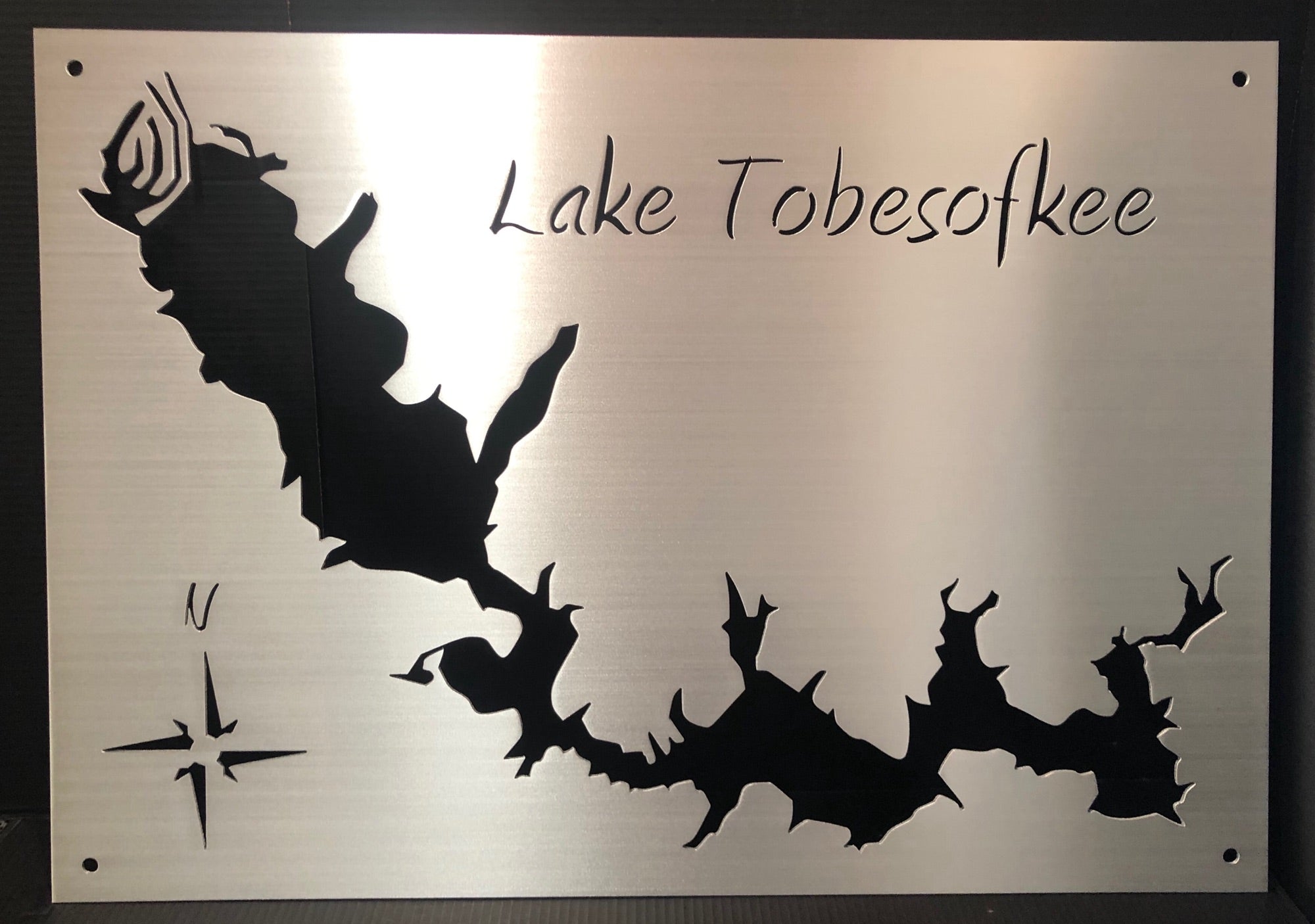 Our Lake Tobesofkee Metal Lake Map is 23×32″ in size and when mounted, your map will appear to be floating 3/4 Inch off the wall using our standard hardware. Each Lake map is made from 1/8′ Sheet Aluminum, brushed and then clear coated. They can be mounted indoors or outside with no problem.