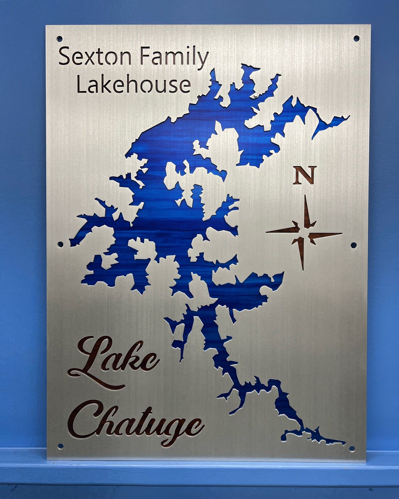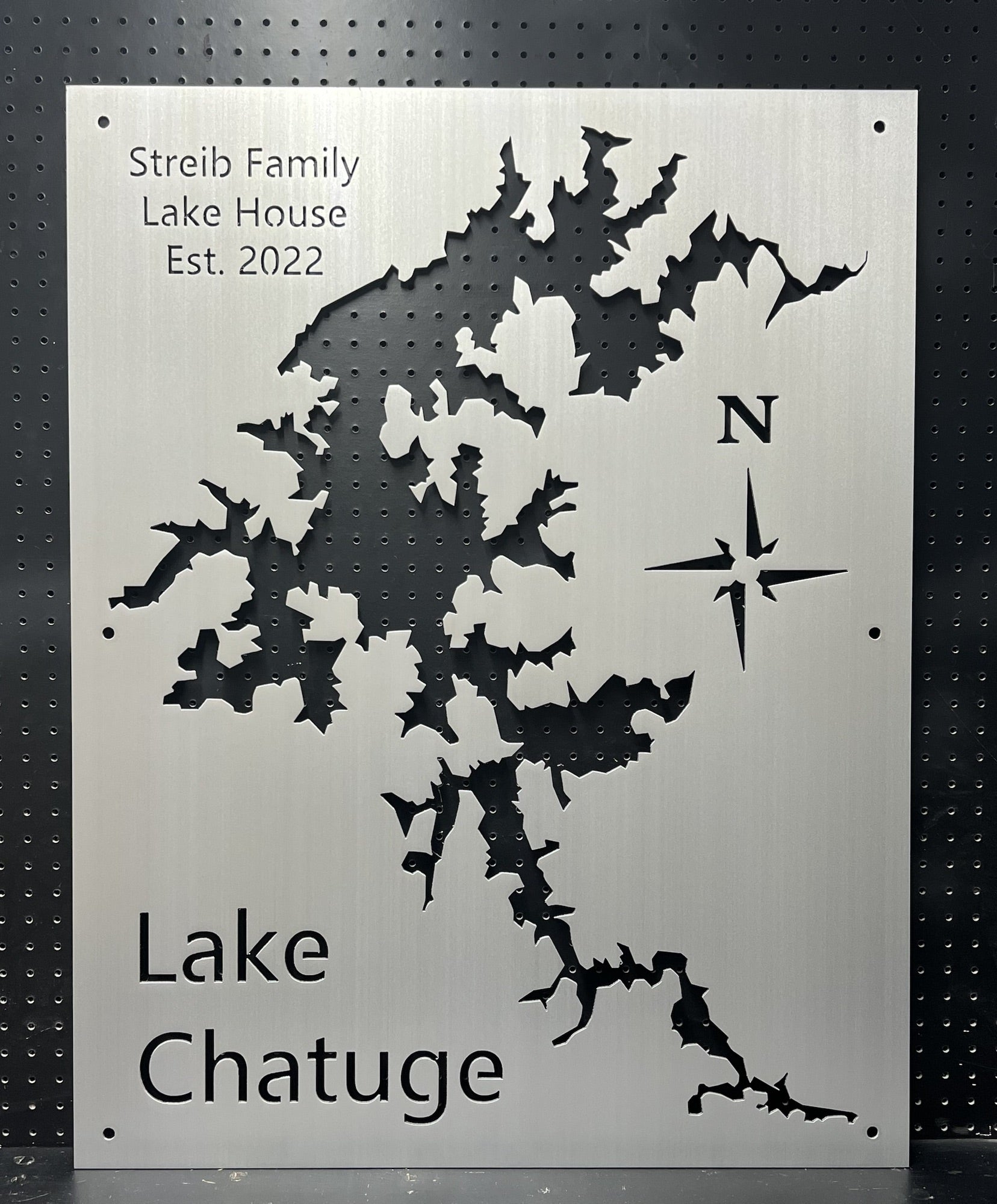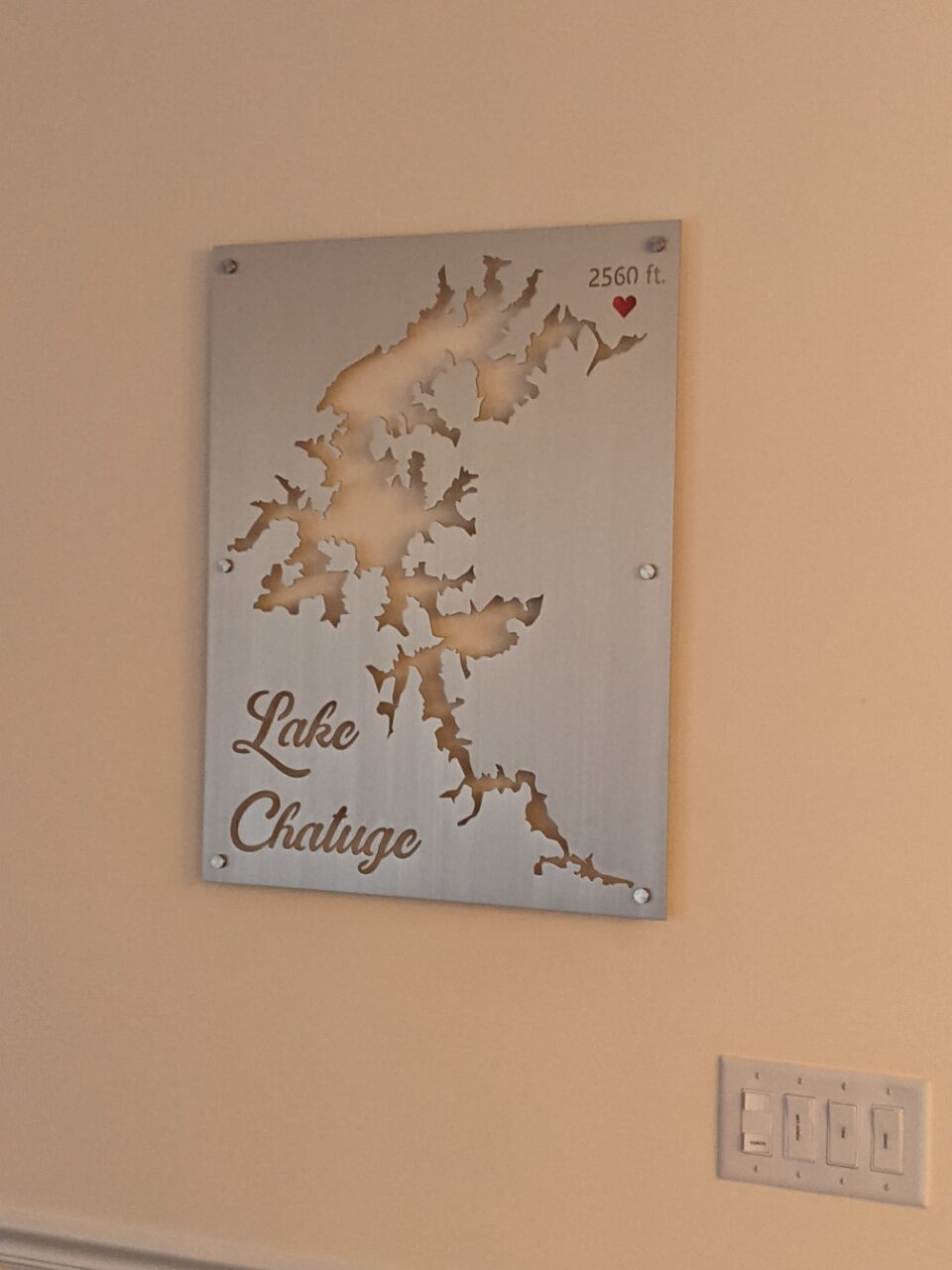 Our Lake Chatuge Metal Lake Map is 23×29″ in size and when mounted, your map will appear to be floating 3/4 Inch off the wall using our standard hardware. Each Lake map is made from 1/8′ Sheet Aluminum, brushed and then clear coated. They can be mounted indoors or outside with no problem.