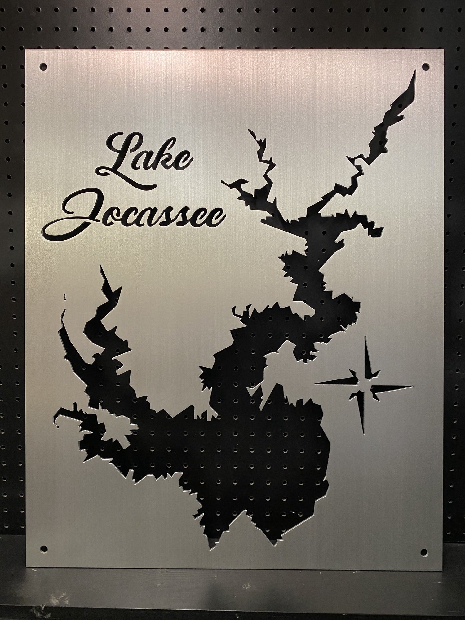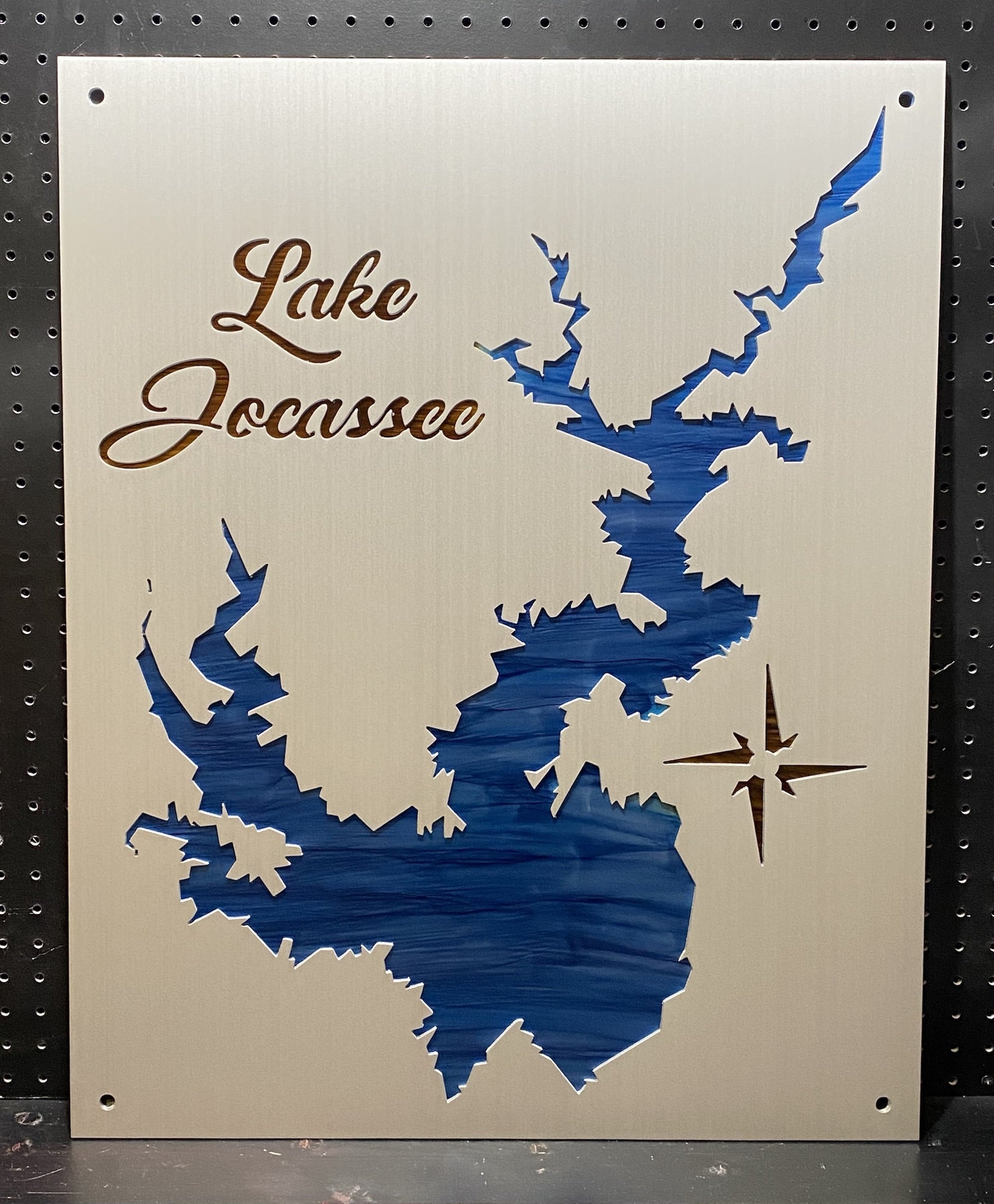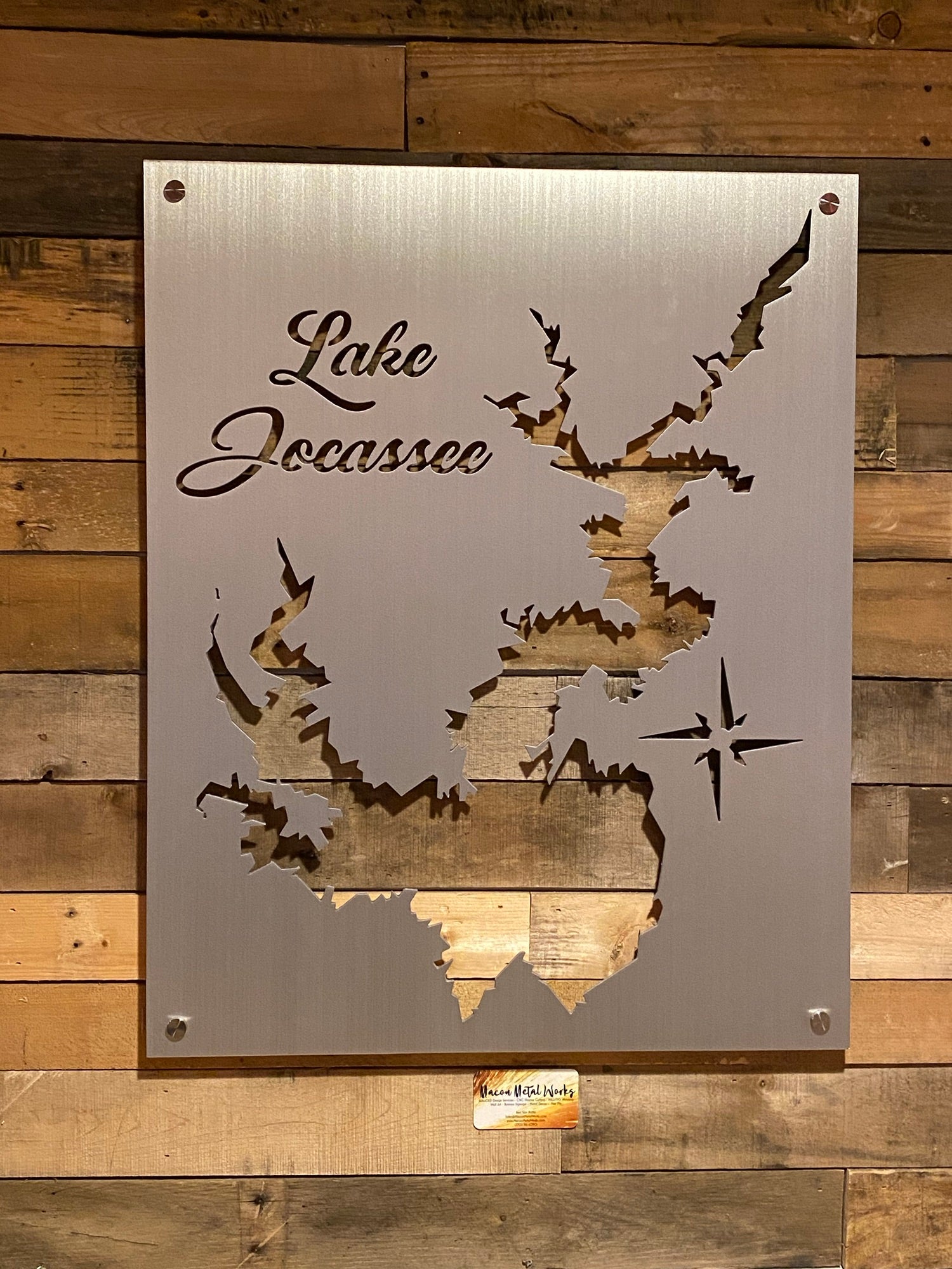 Our Lake Jocassee Metal Lake Map is 23×28″ in size and when mounted, your map will appear to be floating 3/4 Inch off the wall using our standard hardware. Each Lake map is made from 1/8′ Sheet Aluminum, brushed and then clear coated. They can be mounted indoors or outside with no problem.