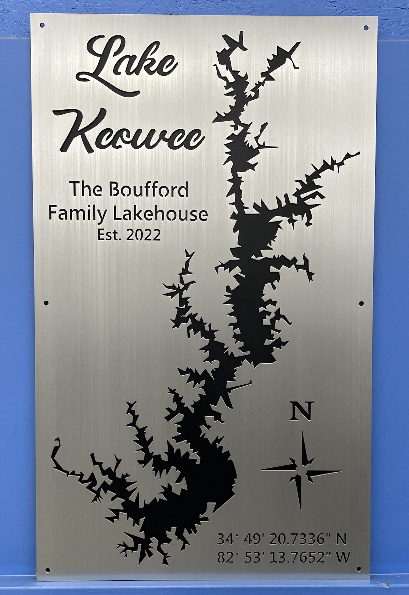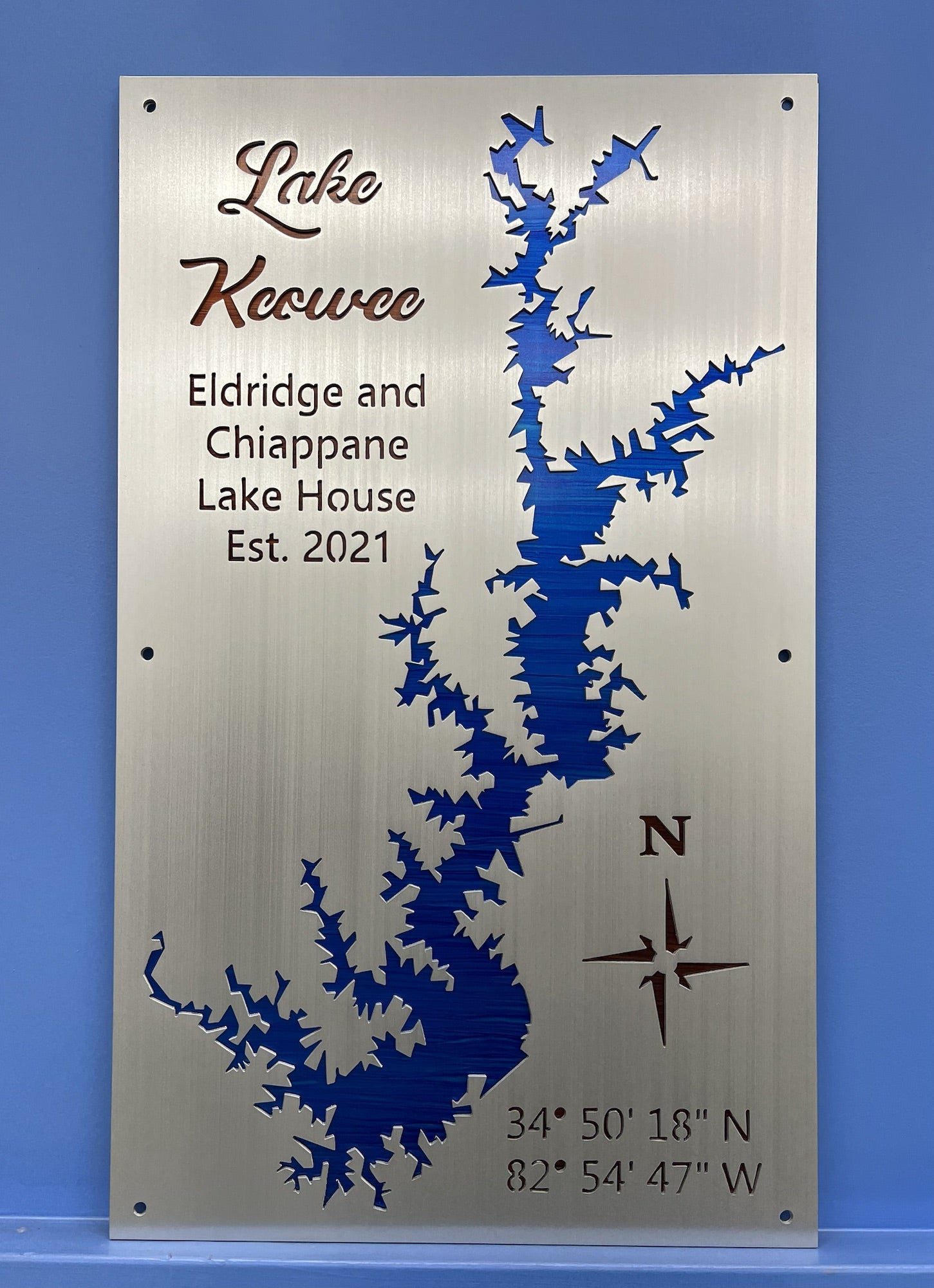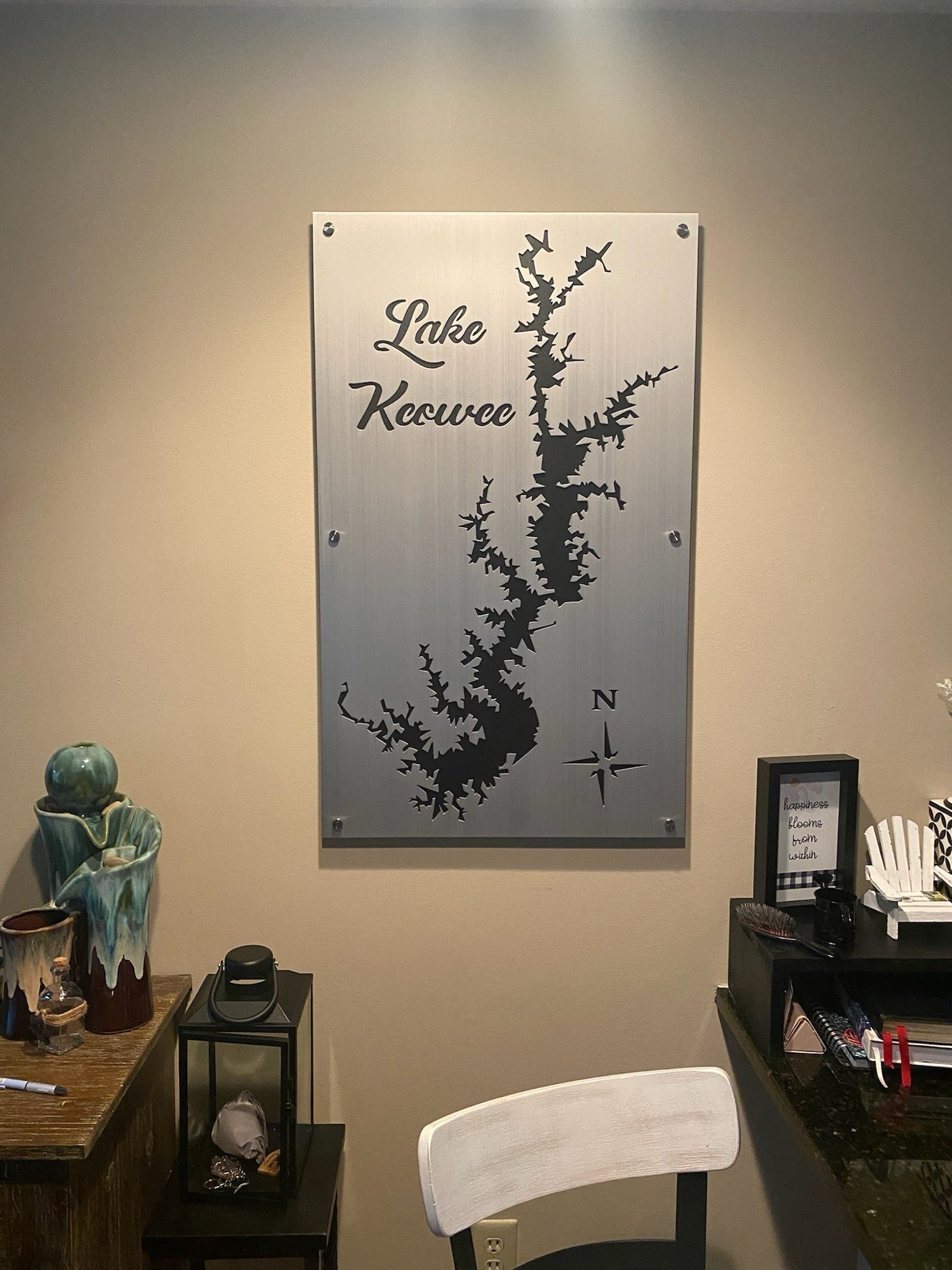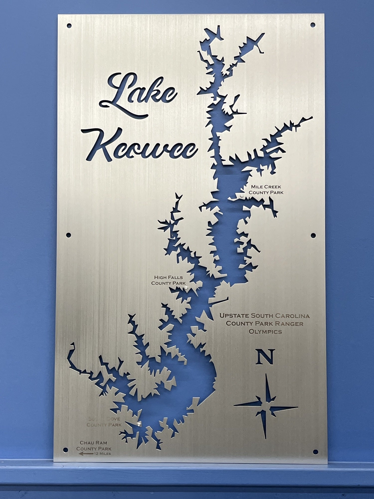 Our Lake Keowee Metal Lake Map is 23×38″ in size and when mounted, your map will appear to be floating 3/4 Inch off the wall using our standard hardware. Each Lake map is made from 1/8′ Sheet Aluminum, brushed and then clear coated. They can be mounted indoors or outside with no problem.