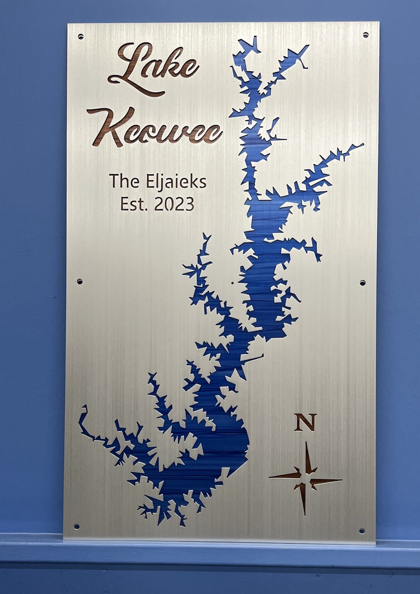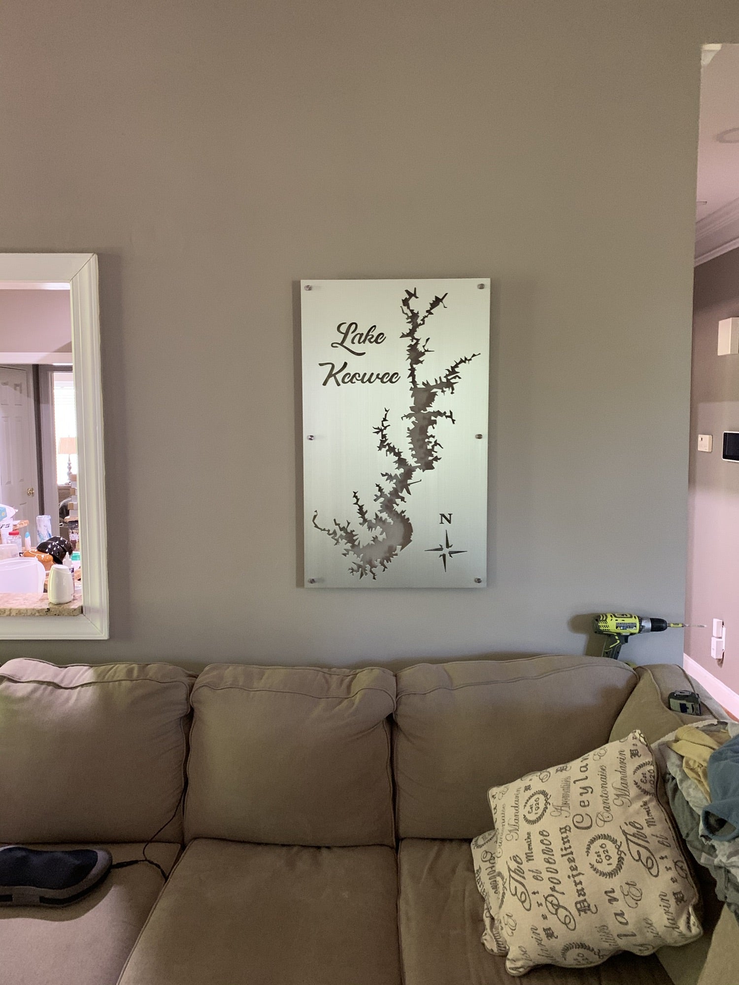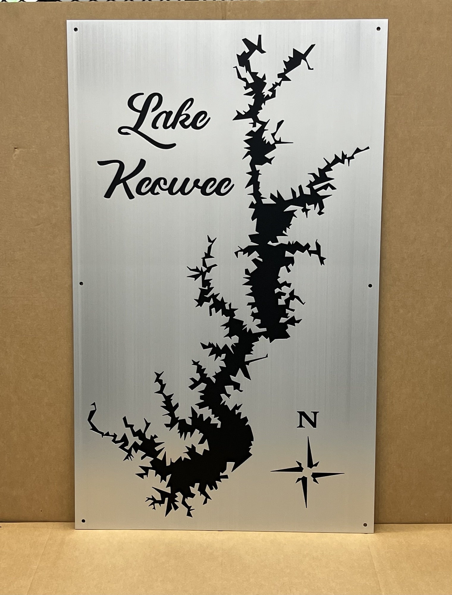 Our Lake Keowee Metal Lake Map is 23×38″ in size and when mounted, your map will appear to be floating 3/4 Inch off the wall using our standard hardware. Each Lake map is made from 1/8′ Sheet Aluminum, brushed and then clear coated. They can be mounted indoors or outside with no problem.