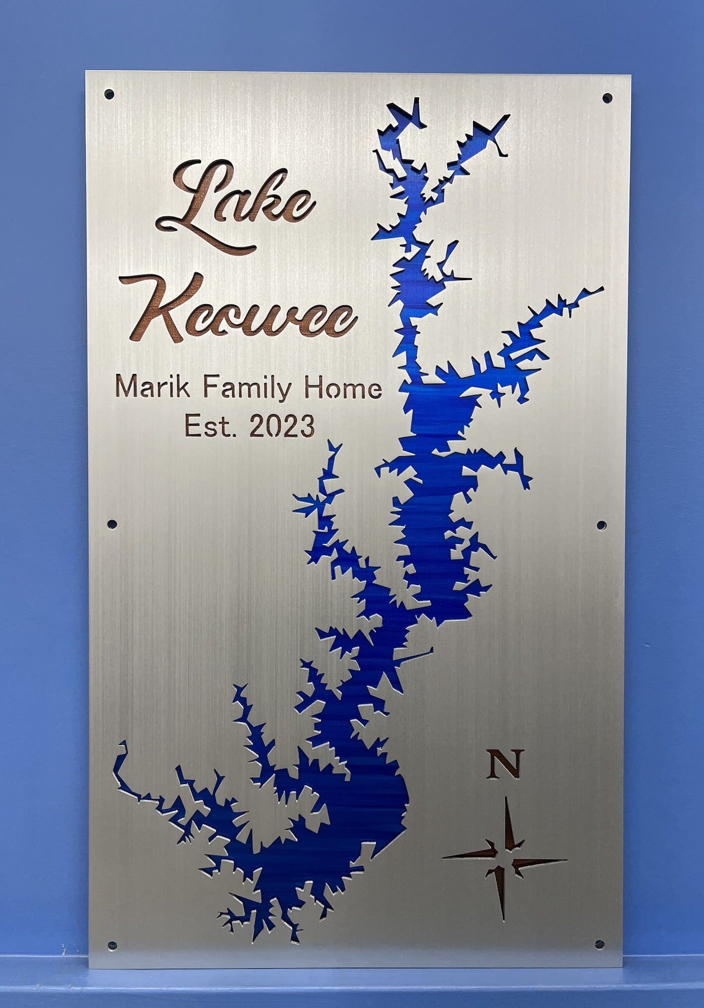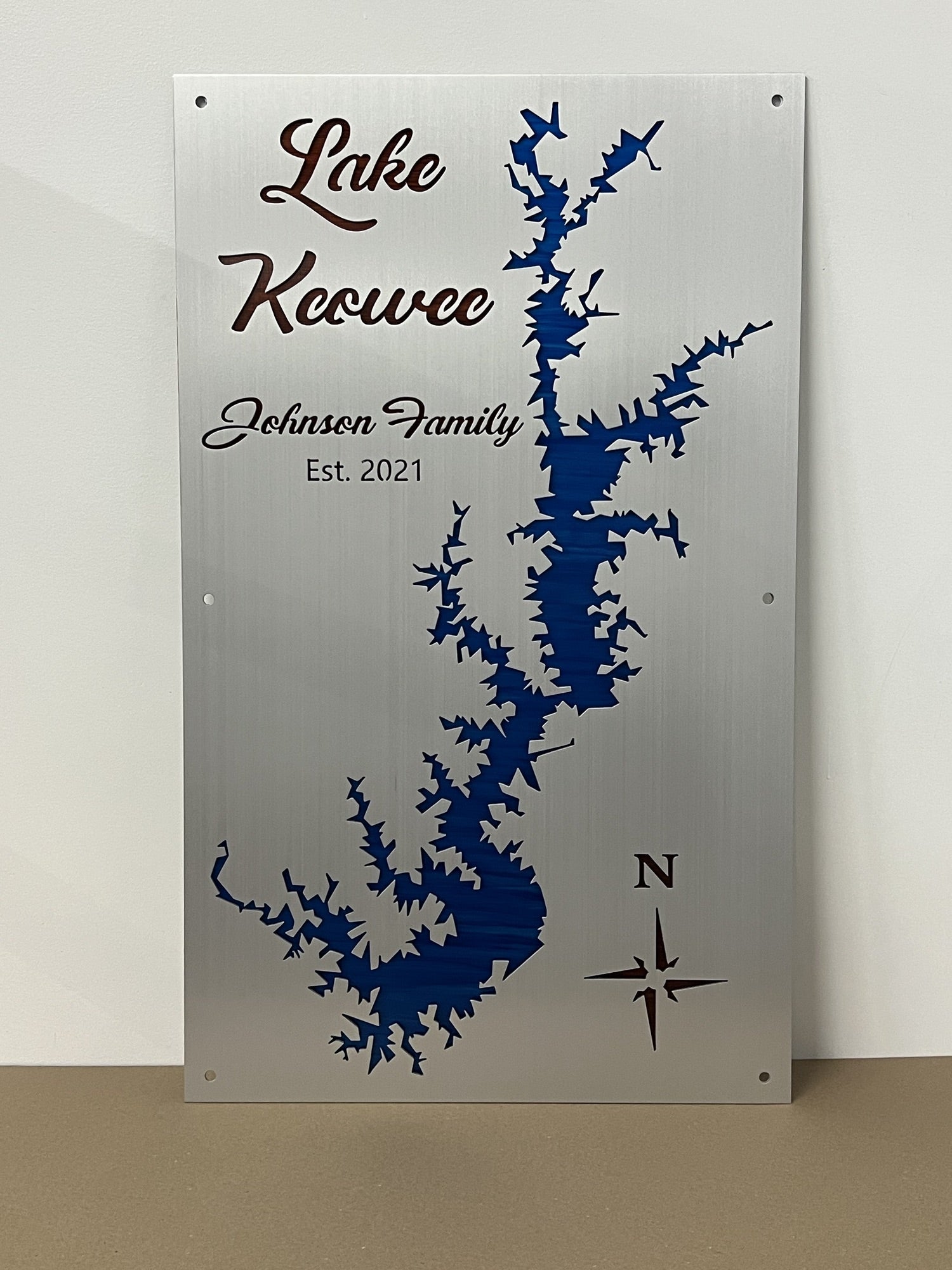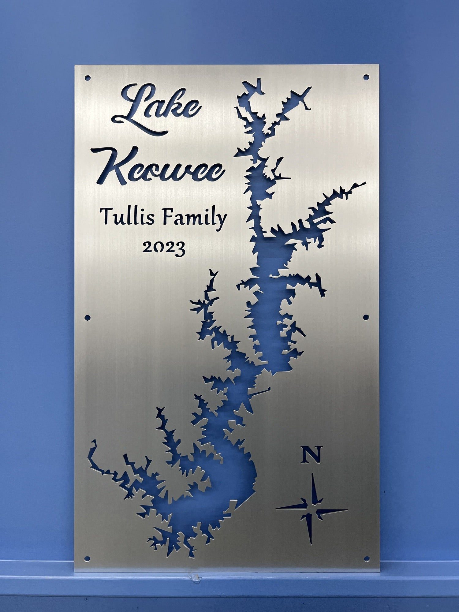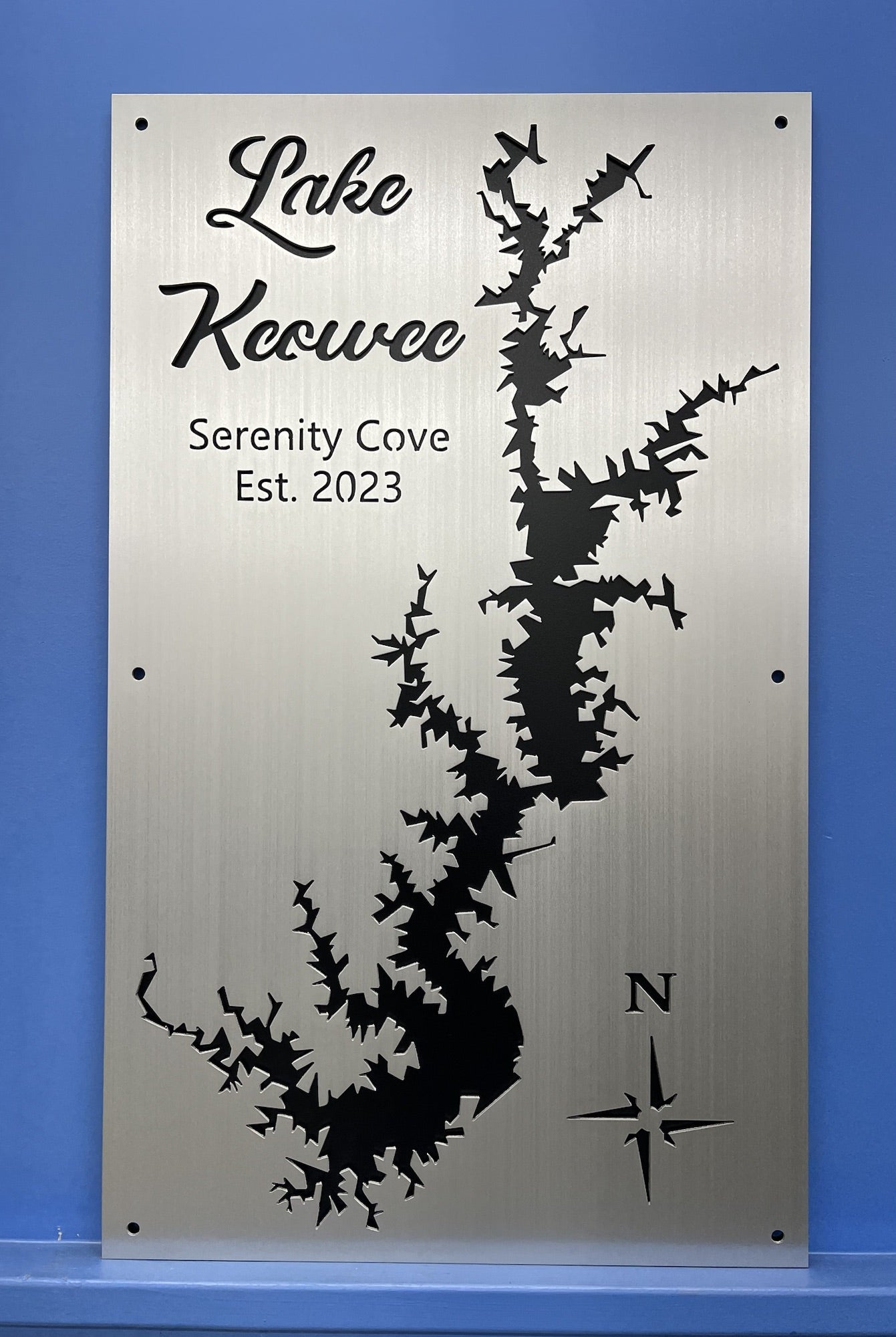 Our Lake Keowee Metal Lake Map is 23×38″ in size and when mounted, your map will appear to be floating 3/4 Inch off the wall using our standard hardware. Each Lake map is made from 1/8′ Sheet Aluminum, brushed and then clear coated. They can be mounted indoors or outside with no problem.