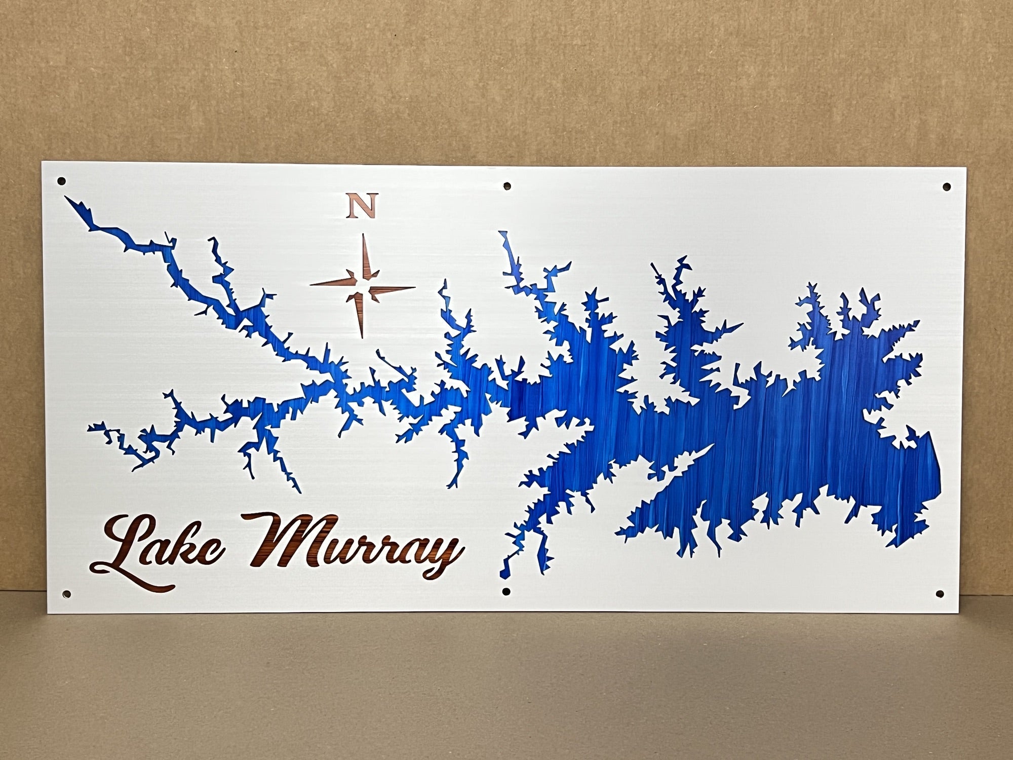 Our Lake Murray Metal Lake Map is 23×47″ in size and when mounted, your map will appear to be floating 3/4 Inch off the wall using our standard hardware. Each Lake map is made from 1/8′ Sheet Aluminum, brushed and then clear coated. They can be mounted indoors or outside with no problem.
