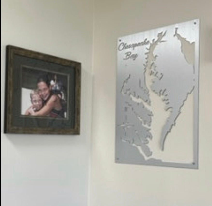 Our Chesapeake Bay Metal Coastal Map is 23×33″ in size and when mounted, your map will appear to be floating 3/4 Inch off the wall using our standard hardware. Each Lake map is made from 1/8′ Sheet Aluminum, brushed and then clear coated. They can be mounted indoors or outside with no problem.